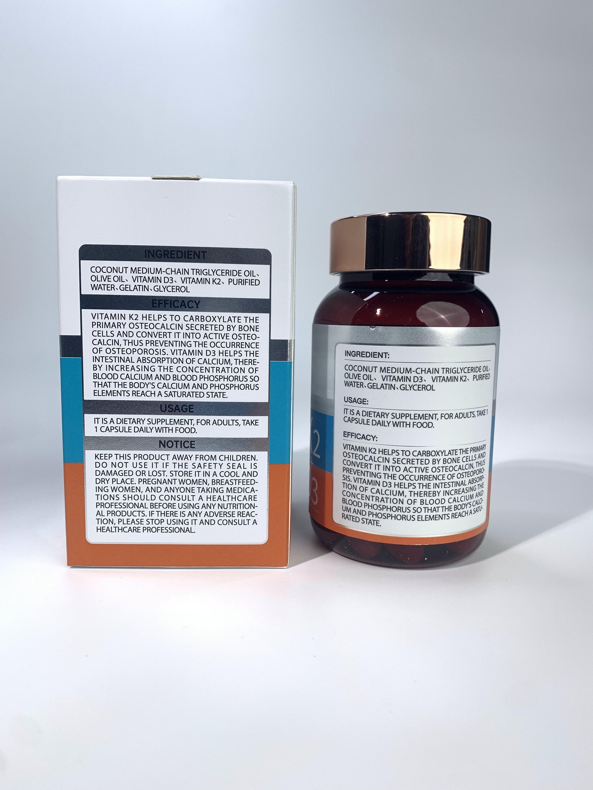 Ingredient:Coconut medium-chain triglyceride oil、olive oil、vitamin d3、vitamin k2、purified water、gelatin、glycerol